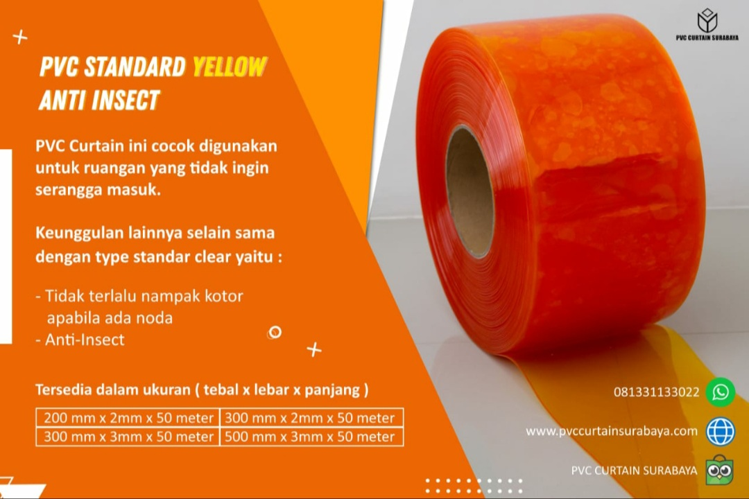 PVC Standard Yellow Anti Insect by admin | Apr 8, 2026 | Produk | 0 comments PVC Curtain ini cocok untuk ruangan yang tidak ingin ada serangga masuk. PVC ini tidak terlalu tampak jika terkena noda Submit a Comment Cancel replyYour email address will not be published. Required fields are marked *Comment * Name * Email * Website Save my name, email, and website in this browser for the next time I comment.